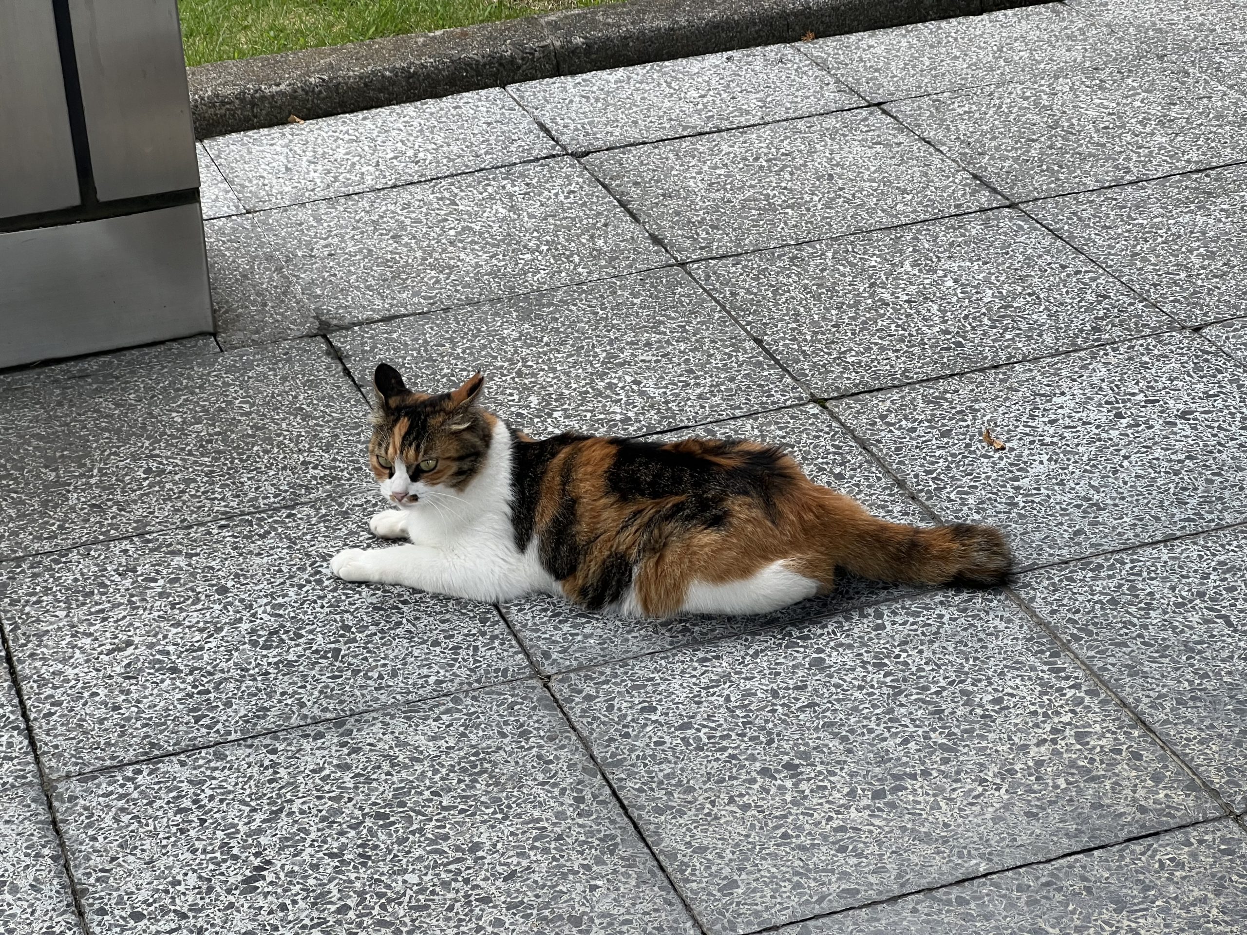 国立音大本部棟前でいつも座り込んでいる猫ちゃん。。。酷暑でも雨模様でもお構いなし。行事があろうと、試験日だろうと、先生方が前を通ろうと、知らん顔を決め込む堂々たるマイペースぶりを発揮しています。