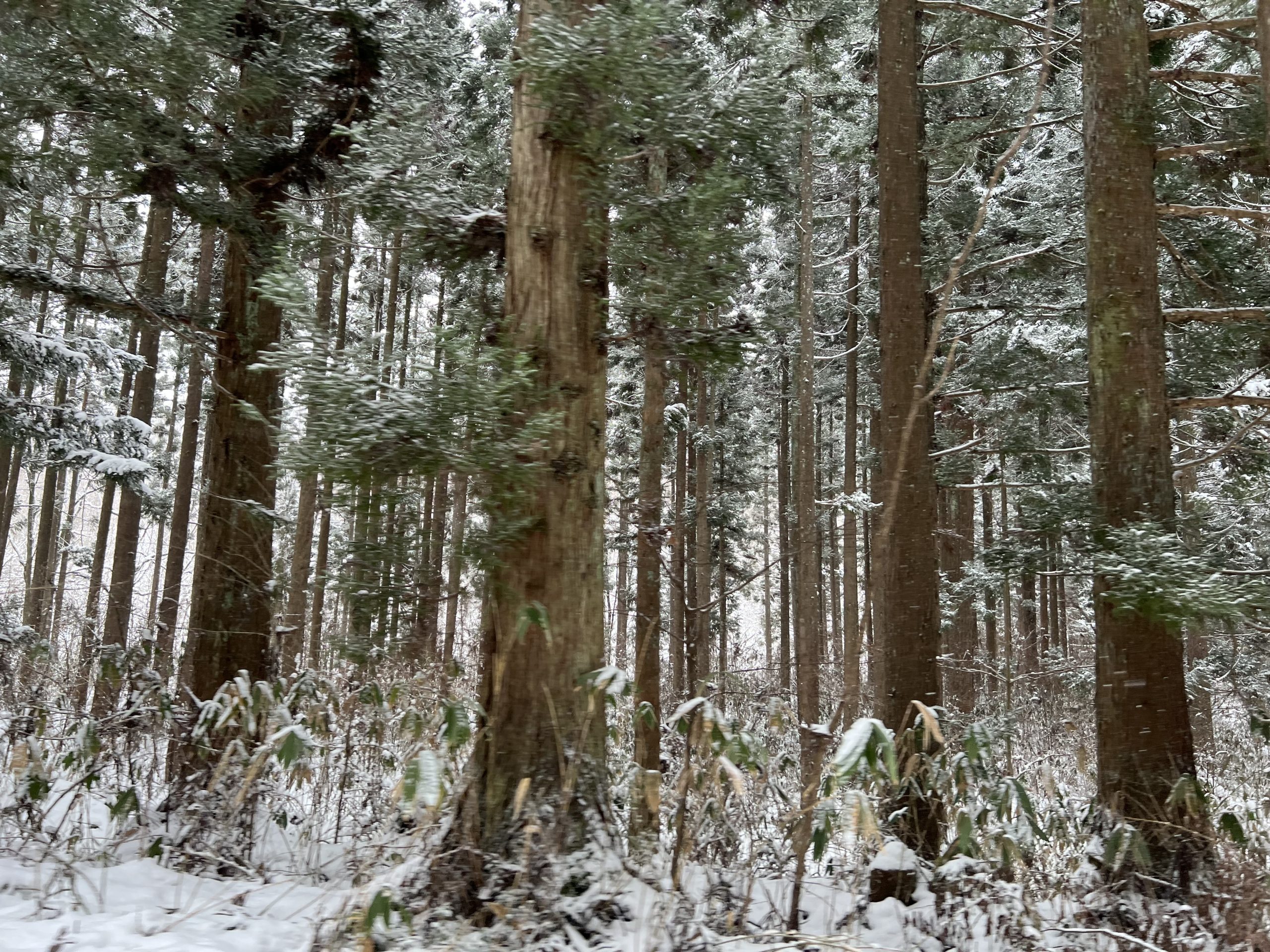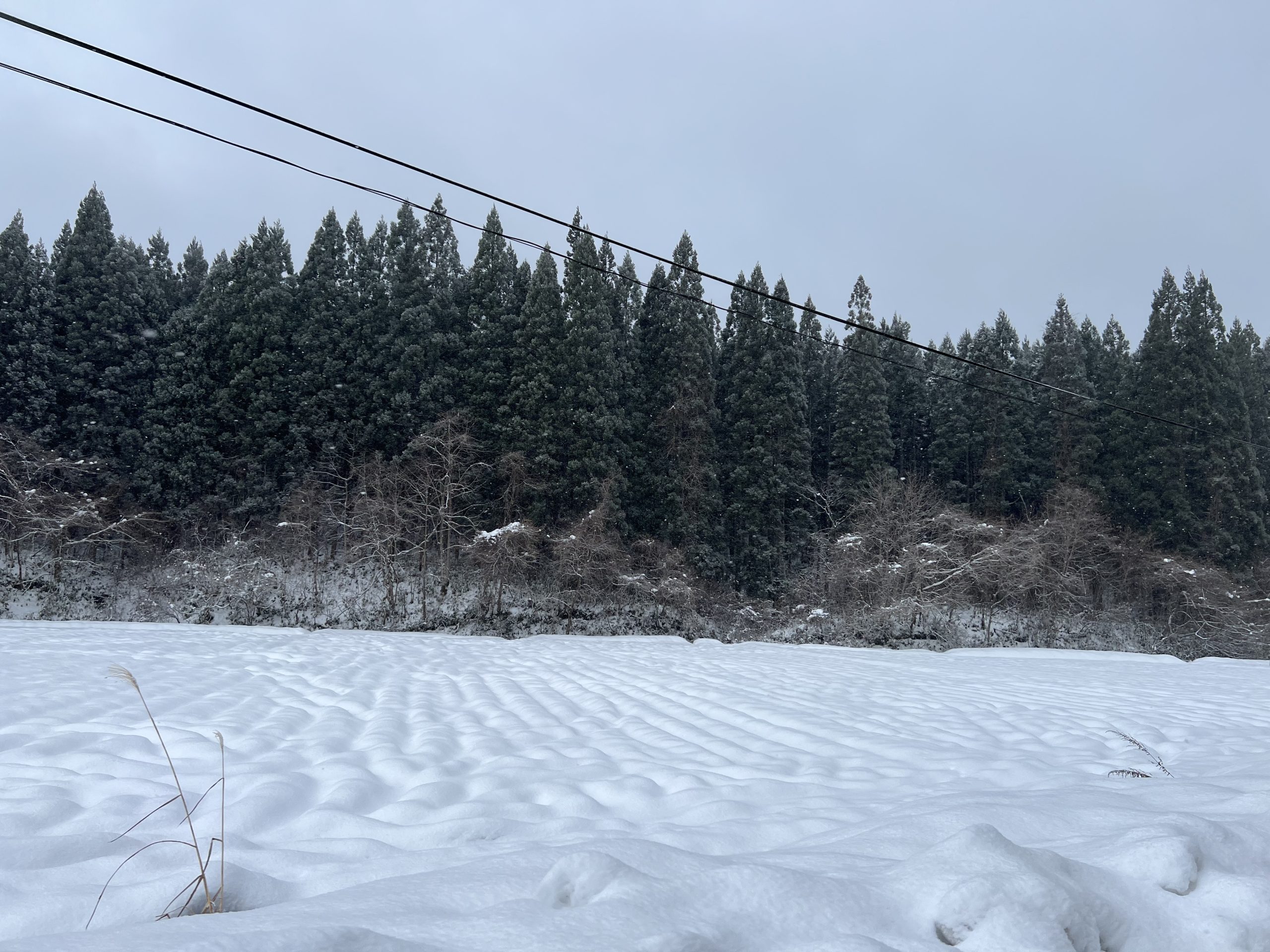 普段なら遠く向こうに大平山が見える絶景の道だそうですが、今日はすぐ前も見えないくらいの吹雪です。