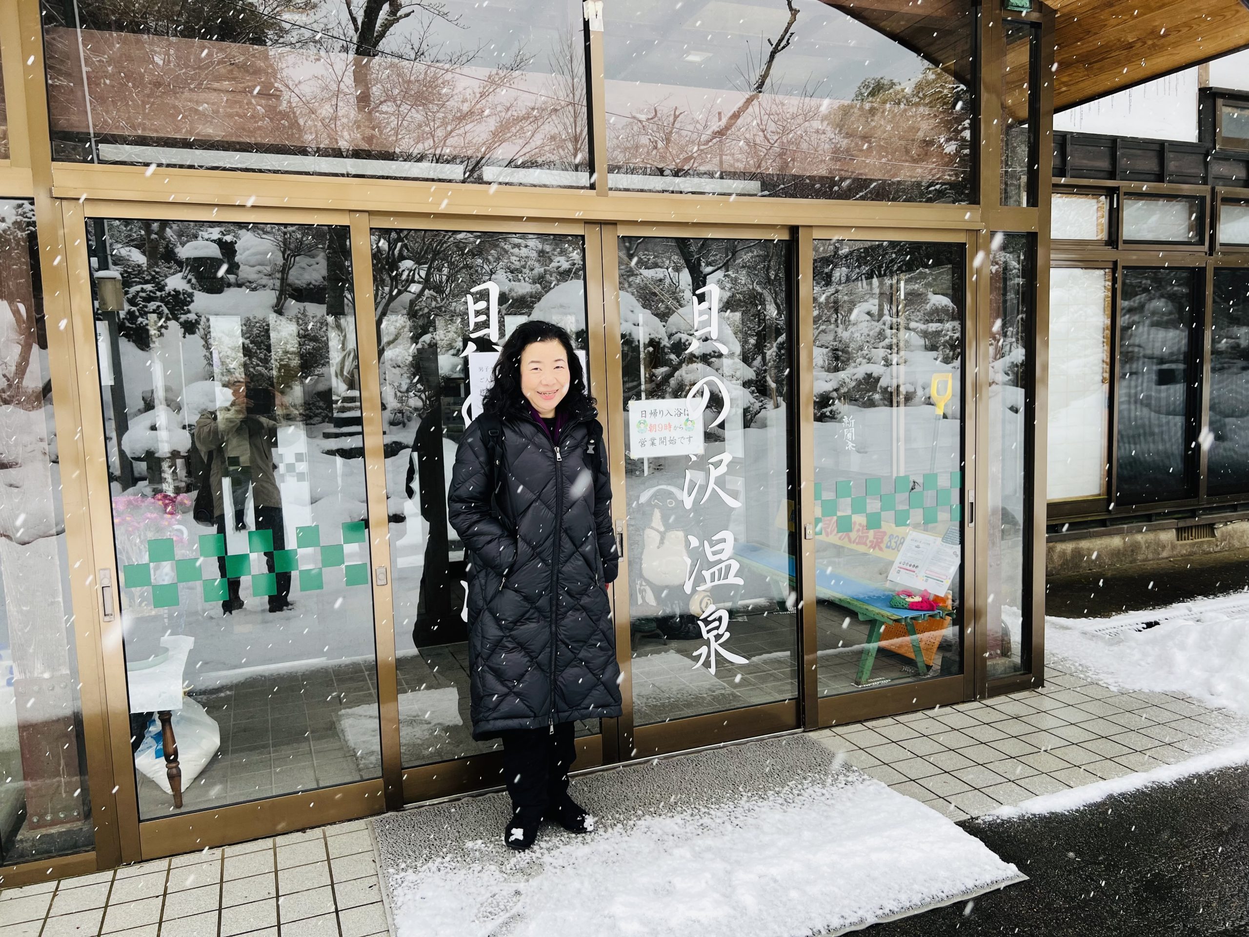 藤田の強烈な人生に想いを馳せながら美術館をあとにし、吹雪の中を太平山麓に位置する「貝の沢温泉」へ。