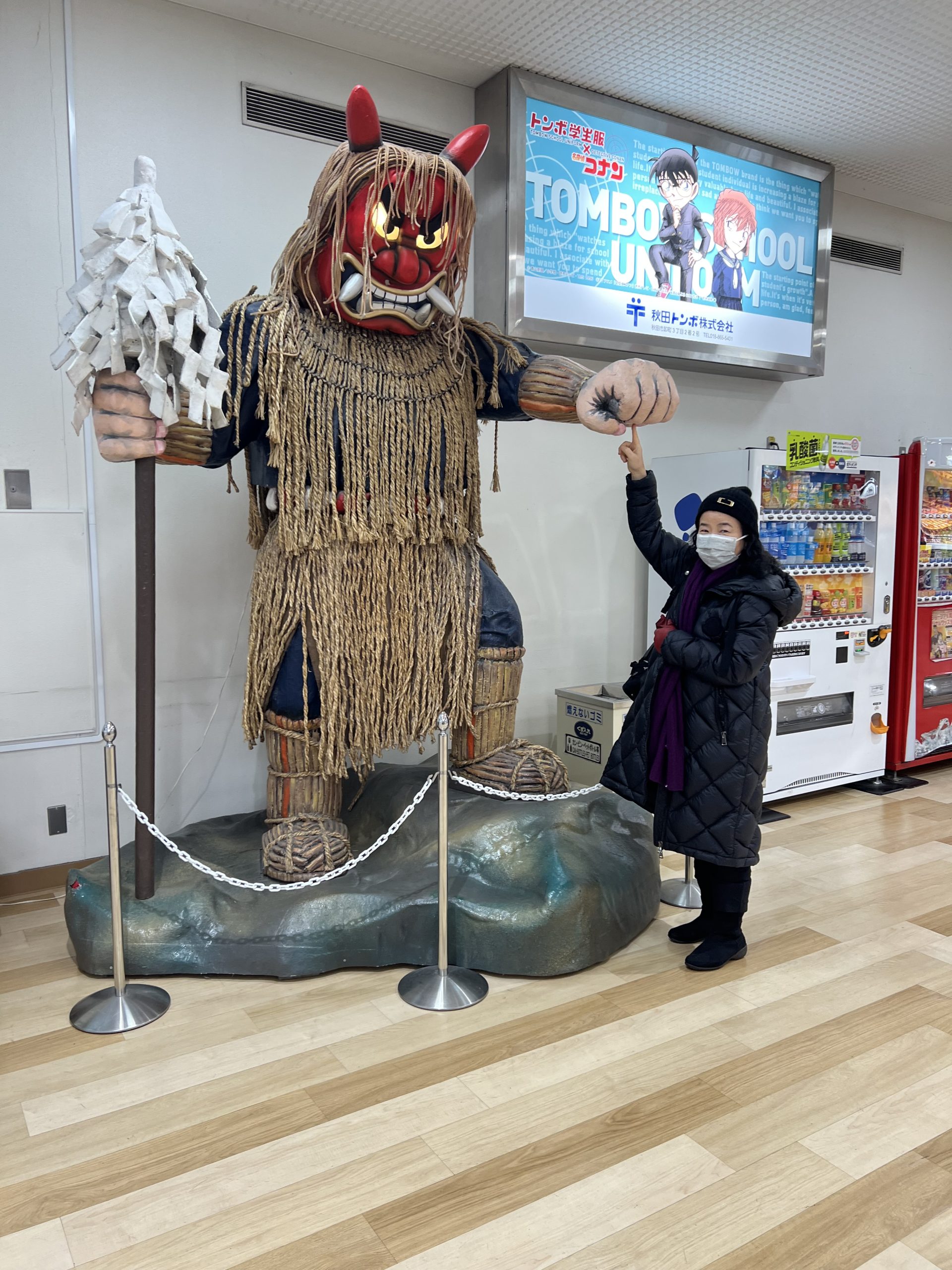 ご機嫌で空港に到着。ところが飛行機は雪で1時間以上の遅れ。でも飛ぶだけ有難いこと!と思いなおし、なまはげとツーショットで記念撮影したり、秋田での濃密な時間を思い出しながら珈琲タイム・・・その後、機上へ。