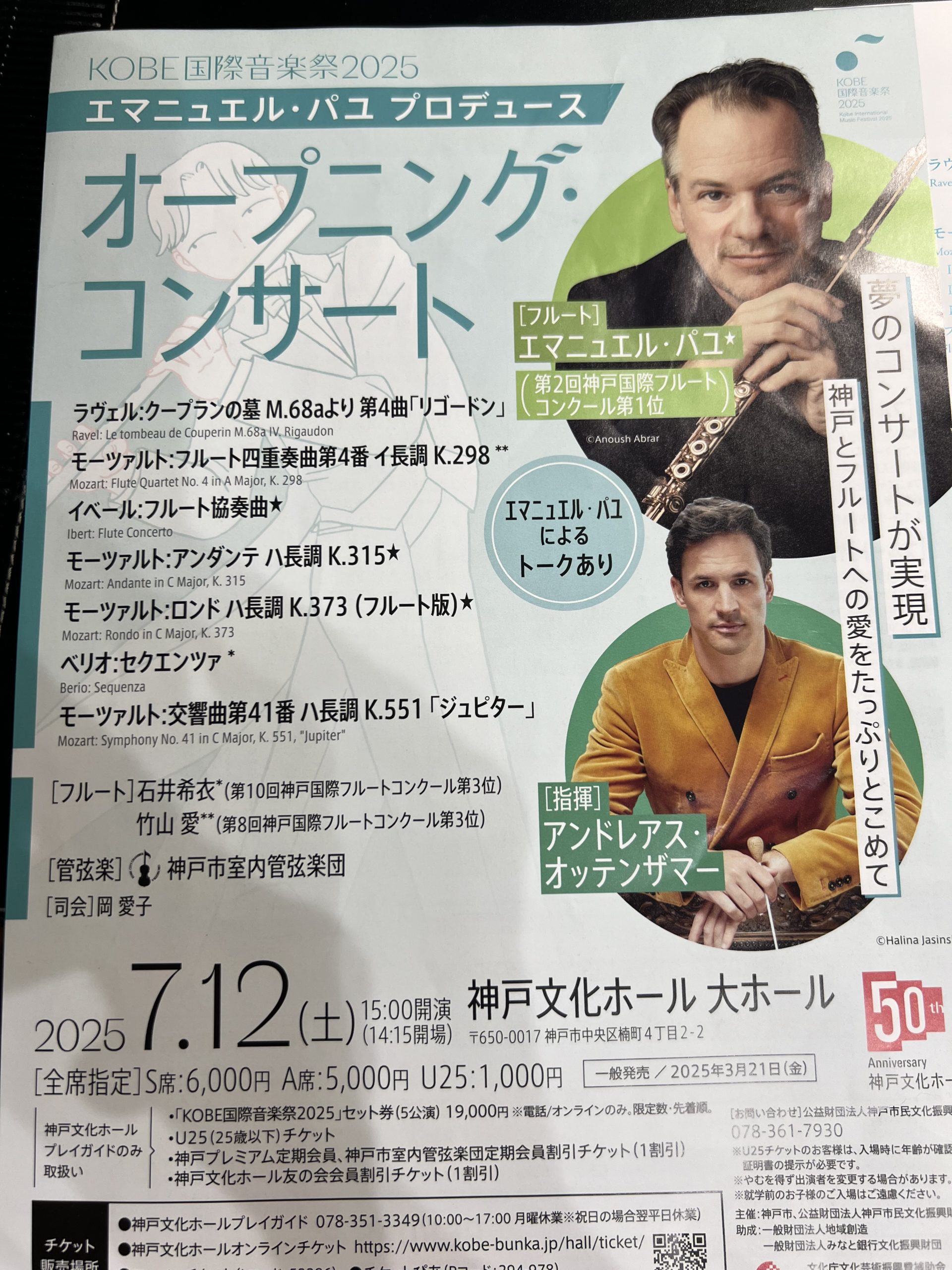 KOBE国際音楽祭2025が、パユさんプロデュースのコンサートで幕を開けました(7月12日、神戸文化ホール)。