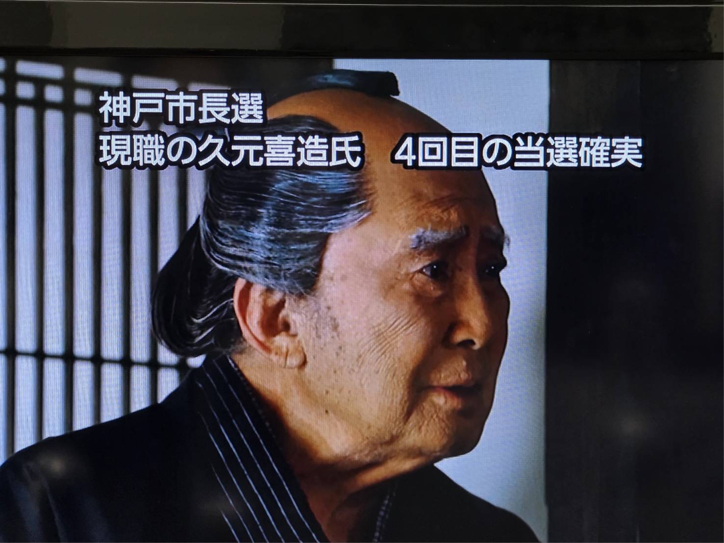 夜は、神戸国際会館へ。控室のテレビ画面を見て結果待ち。投票が締め切られ、開票作業が始まった直後、ドラマの途中で当確のテロップが流れました。