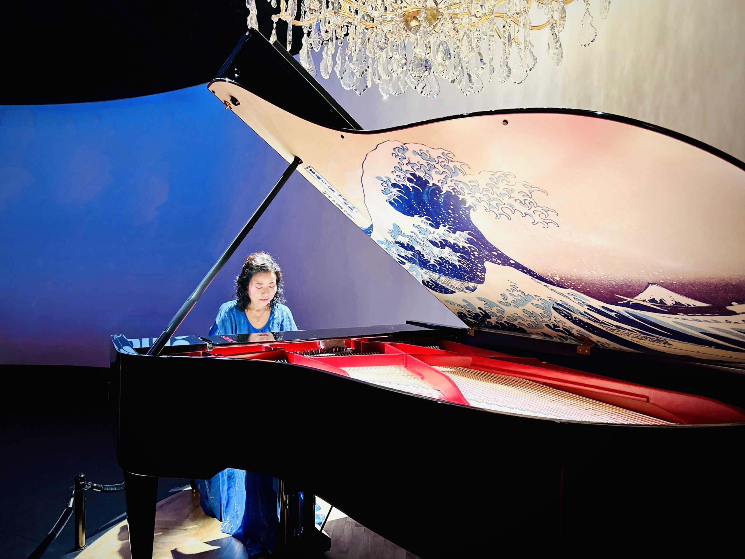 葛飾北斎の「神奈川沖浪裏」が描かれ、朱色のフレームとのコントラストも美しい楽器。目も耳も愉しませてくれるピアノ。明後日の本番で良い音を奏でてくれるよう願いを込めて大事に弾き込みを始めました。