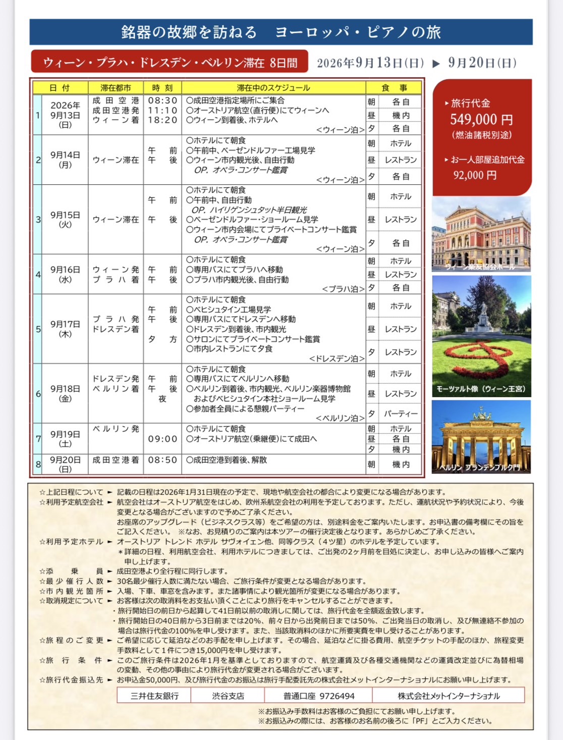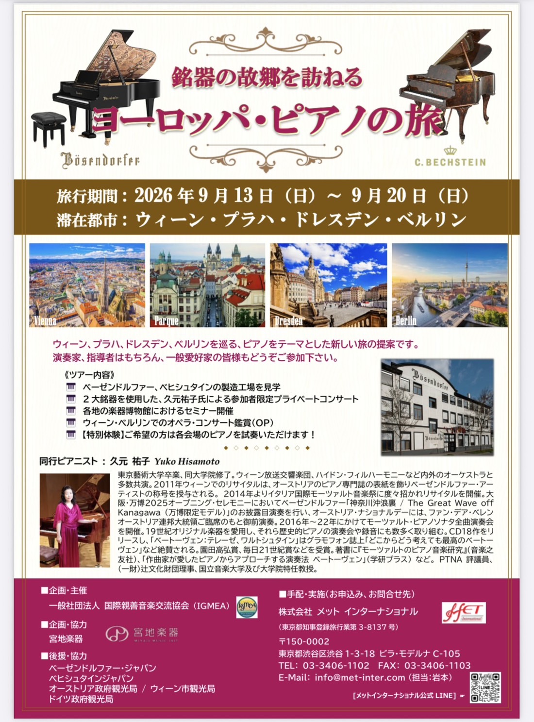ベーゼンドルファーとベヒシュタインの工房を訪ね、楽器博物館を見学。ピアノの故郷を知り、深堀りする旅です。