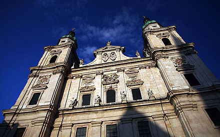 - モーツァルト一家は、音楽に身を捧げる一方、大聖堂、聖ペーター教会、聖三位一体教会などで祈りを捧げましたザルツブルクを象徴する建造物、大聖堂 (右の写真)は、1628年、ローマの聖ピエトロ大聖堂を模して建築され、宗教国家ザルツブルクの精神的な中心となりました。