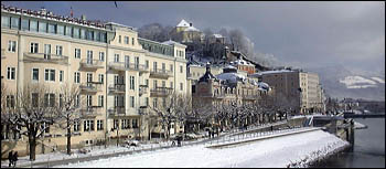 上の写真は、川を挟んで新市街地側を写したものです。手前は王族御用達のホテル、エスタライヒッシャー・ホーフです。